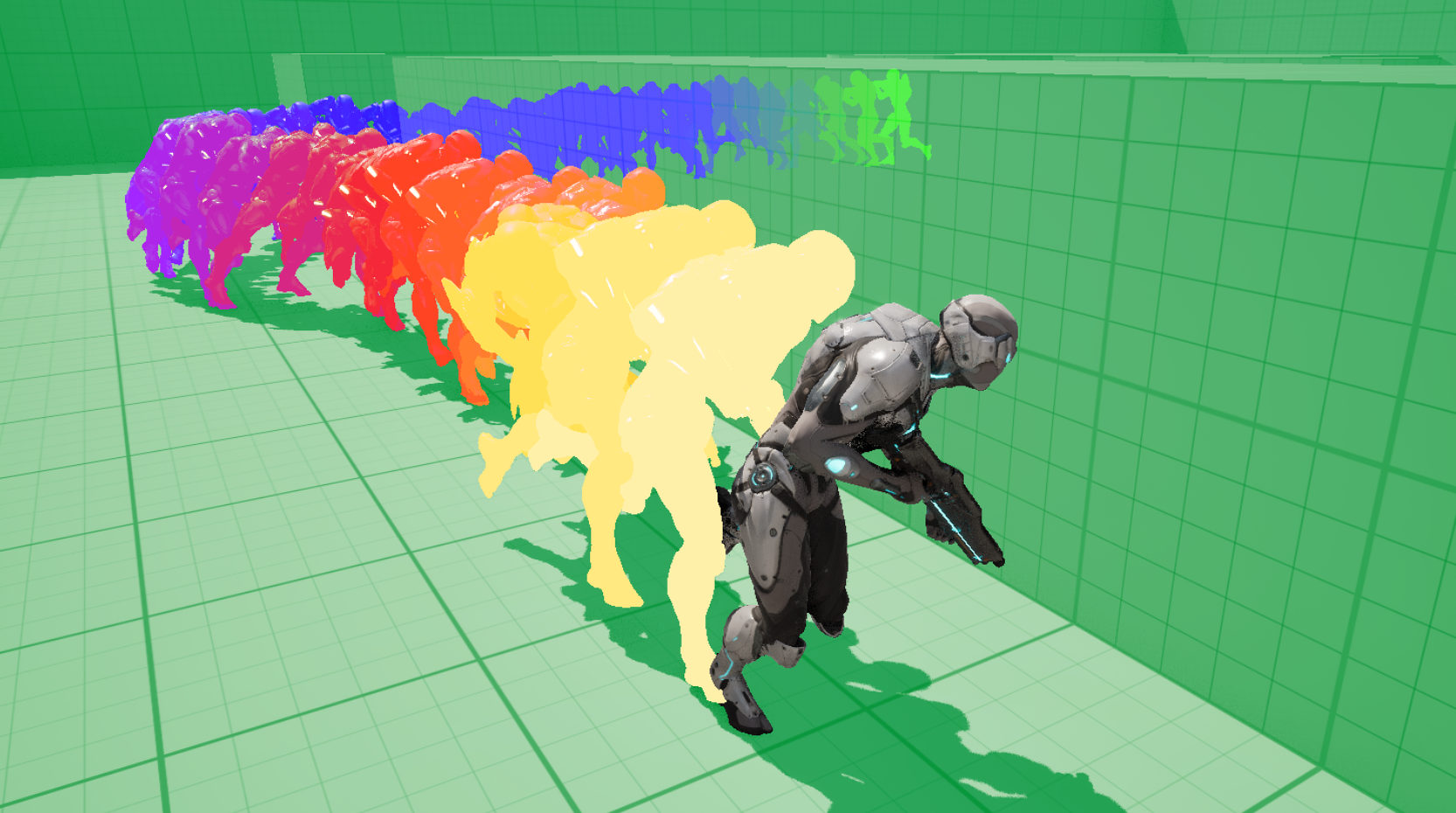 Instead the approach I went for was to spawn a new instance of a blueprint which had a poseable mesh on it, and copy the pose from the player character to the blueprint at the point of creation. Then to add the colour, use a post-processing material with custom stencil values for each "echo" instance. If that doesn't quite make sense then read on!