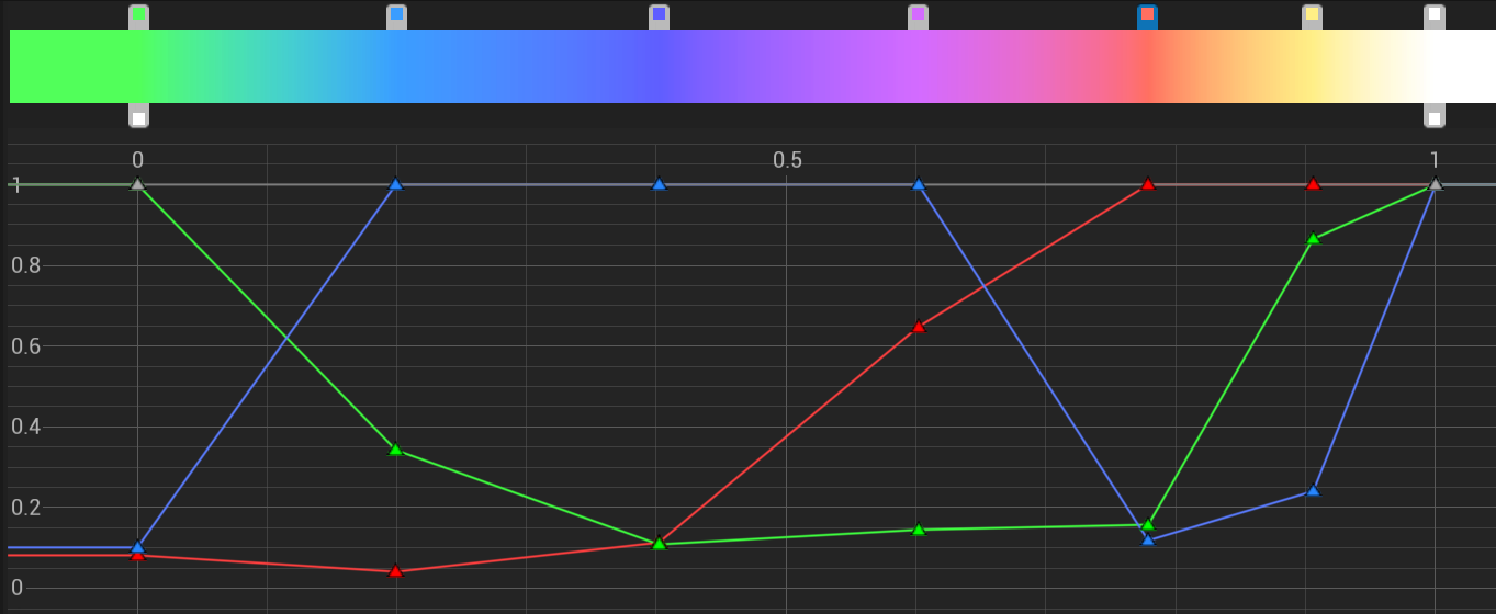 Referring back to the blueprint graphs from the previous section, we can see that each echo is assigned a custom stencil value in the range 205-255 with echoes created towards the beginning of the ability being assigned values closer to 205, and echoes towards the end closer to 255. Side note: I could have also used values 1-50 instead of 205-255, but the latter just makes some of the material maths a bit simpler. Now given a range of stencil values, how do we map them onto the correct colours? Enter Linear Color Curves!