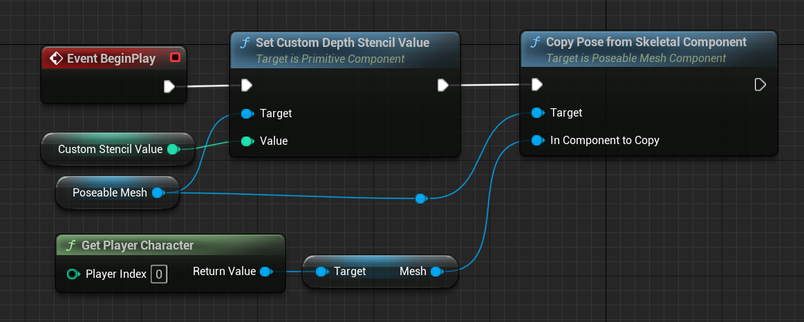 As for the logic within the echo itself, it's simply setting a custom depth stencil value and copying the pose that the player character is in at the point at which it's created.