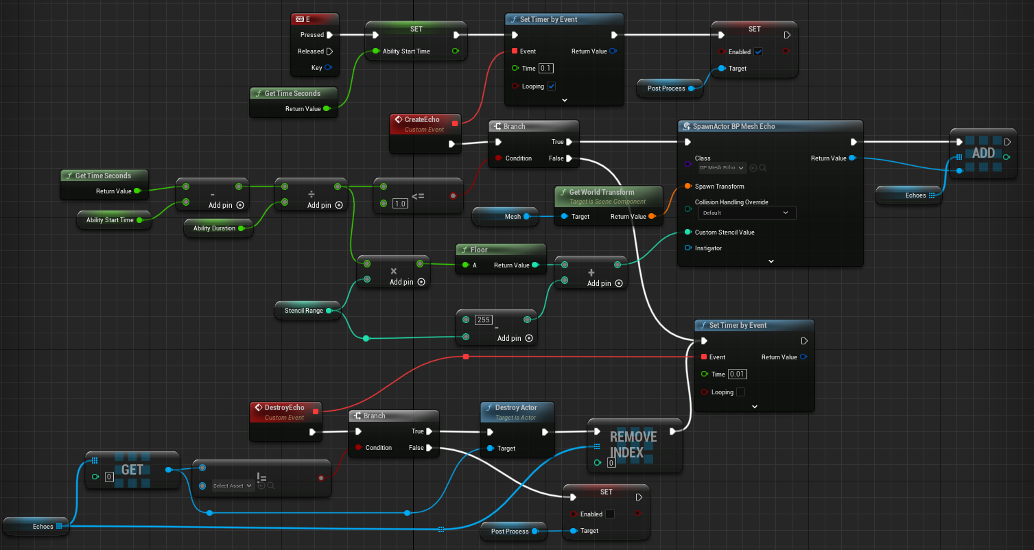 Hopefully you can see from the above blueprint graph that the echo creation and destruction isn't too complex (if you ignore the stencil values for now). For creation we simply record the start time of the ability, then start a loop using timers that will create a new echo every 0.1 seconds until the ability duration is reached. We add each new echo to an array so that we can destroy them one by one when the effect is finished. We want to stagger the destruction of the echoes slightly so that it creates an effect of the echoes "catching up" to the player, so we need another timer loop to destroy them one by one every 0.01 seconds.