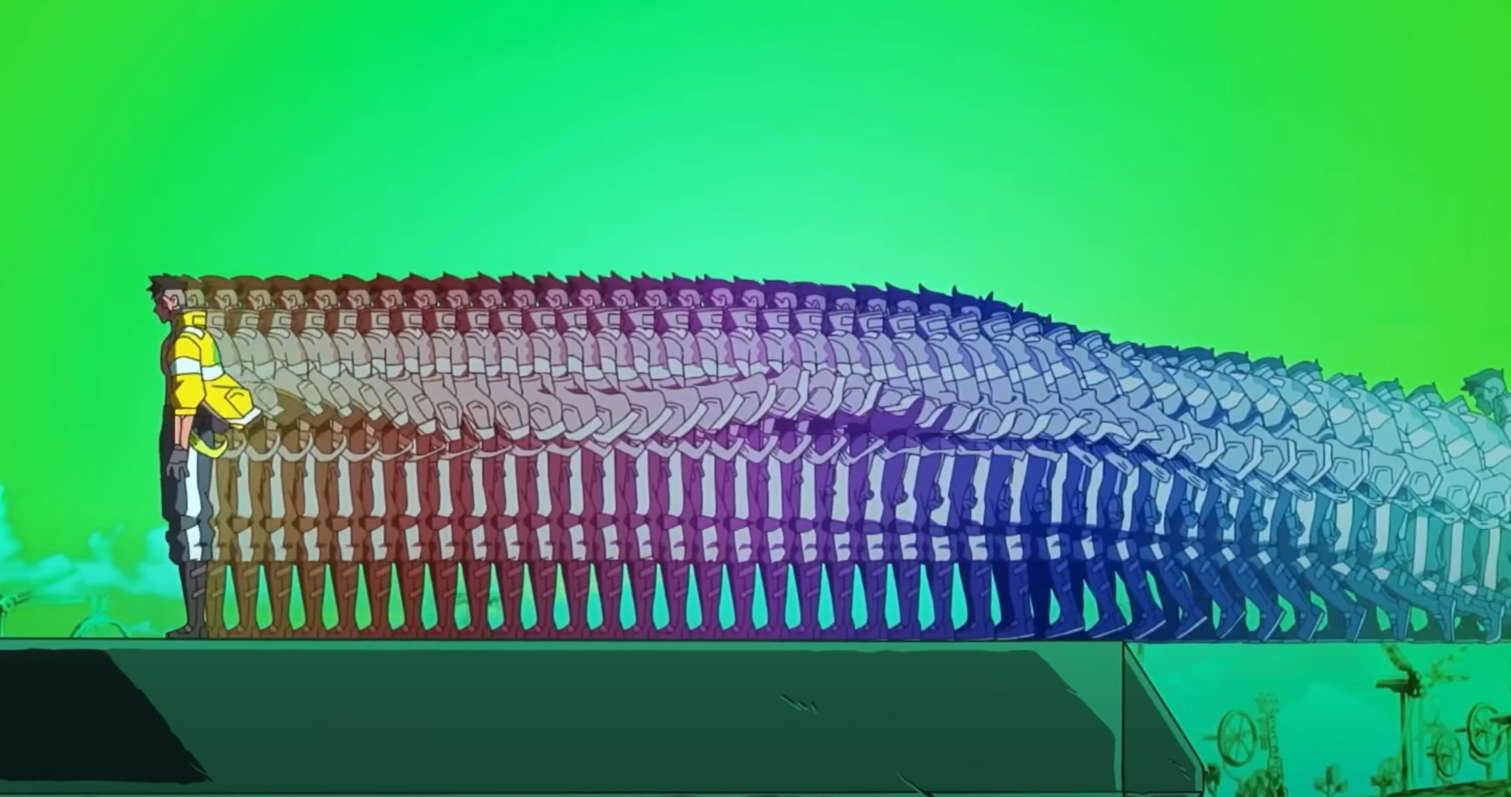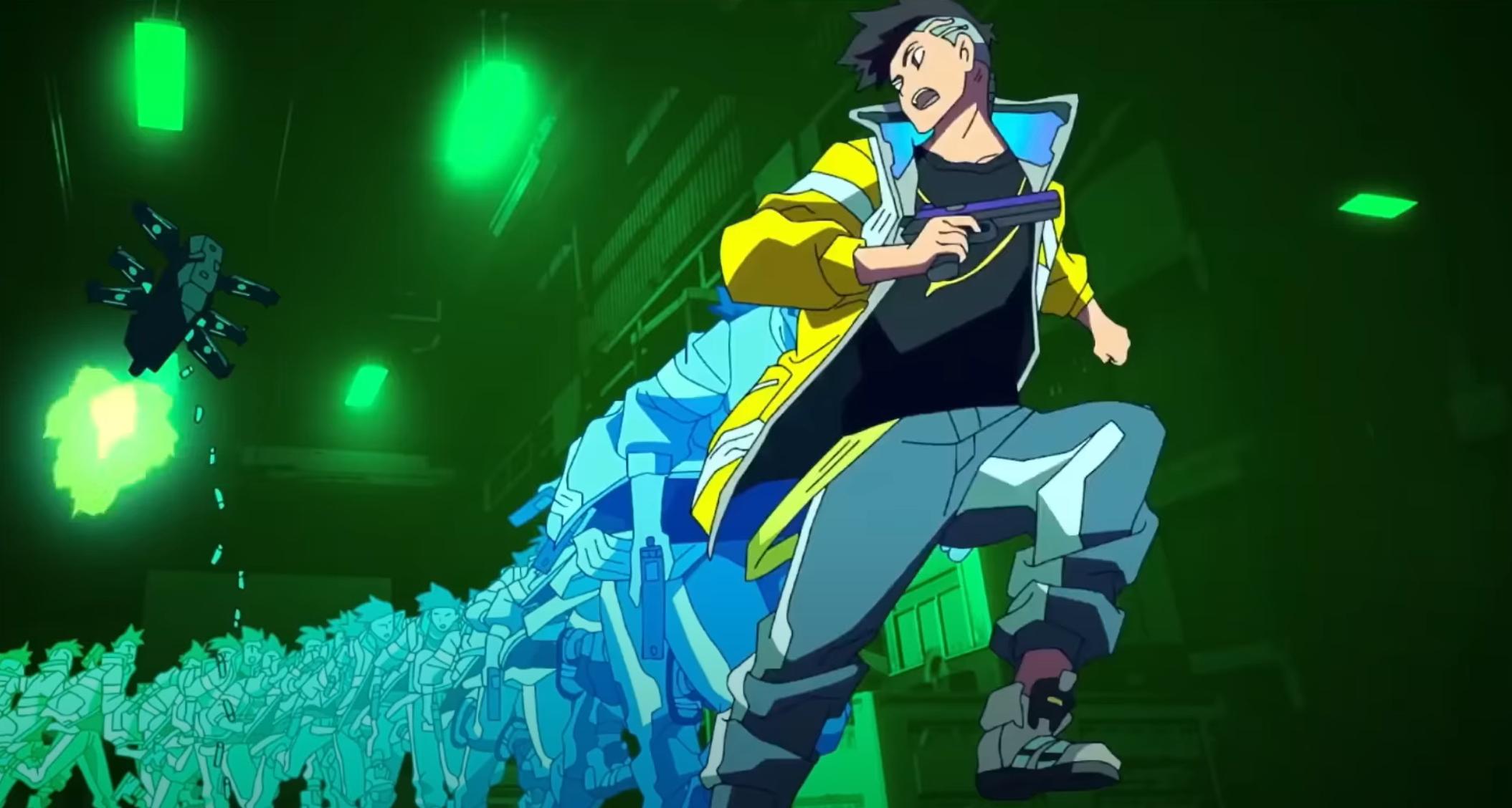 If you're not familiar with the Cyberpunk universe, the Sandevistan is a piece of technology attached to a person's spine that lets them move at incredible speed. For the purposes of the game Cyberpunk 2077, and the TV series Cyberpunk Edgerunners, this is often represented by the main character moving at normal speed while everything else moves in slow motion. In the game, the effect is portrayed through a simple color tint and fisheye post-processing effect. In the TV series however, the world around the user is tinted green while the user leaves "echoes" of themself as seen in the image below.