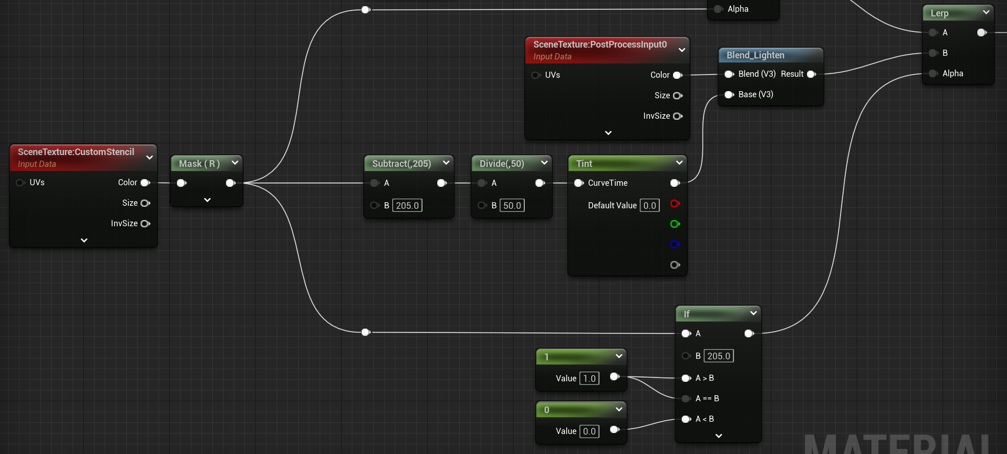 Linear Color Curves in Unreal allow us to easily define a gradient of colours that can be accessed from a material graph. If we map our stencil values to the 0-1 range then we can sample across the range of colours on the curve. The section of material graph below shows the relatively simple logic for grabbing the stencil value, checking if it's in the right range for us (205-255), sampling the colour curve and then blending the output on screen with this color.